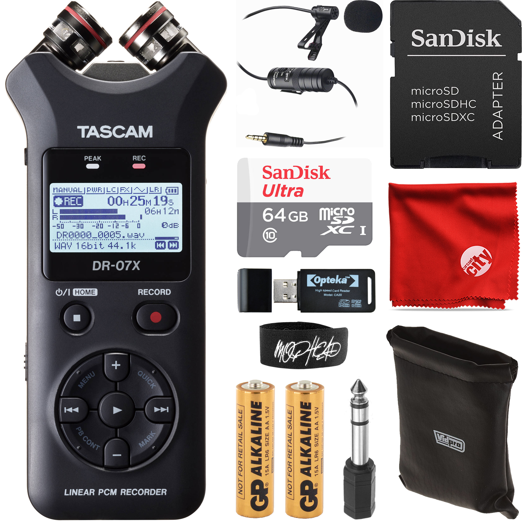 Tascam Dr 07x Stereo Handheld Digital Audio Recorder Usb Interface Bundle With 64gb Memory Card Lapel Microphone Cable Tie
